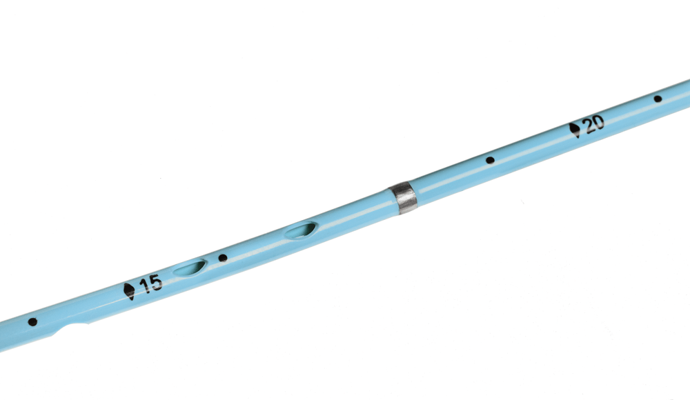 Nieprzepuszczalny dla promieni rentgenowskich marker wskazuje położenie najbliższego otworu drenażowego, ułatwiając umieszczenie cewnika.